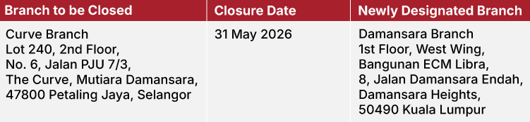 In response to the shift towards online transactions and progress in the digitalisation of our business, please note that the following branch will be closed, with its services transferred to the newly designated branch: