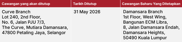 Selaras dengan peralihan kepada transaksi dalam talian dan kemajuan yang dicapai dalam pendigitalan perniagaan kami. Sila ambil perhatian bahawa kami akan menutup cawangan berikut dan perkhidmatannya akan dipindahkan ke cawangan baharu yang telah ditetapkan: